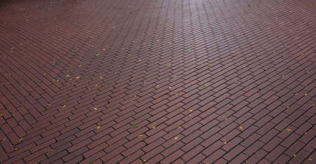 Pedestrian pavement sidewalk background, paving rectangular blocks, red brown color. Walkway pavers perspective view, empty mockup