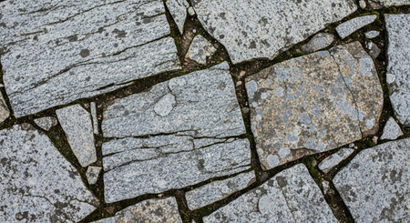 rocky vintage road with different shapes and textures between which sprouts of grass grow