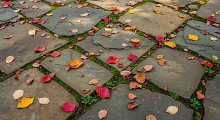 A close-up perspective of a flagstone patio with irregularly shaped stones laid in a pattern. The gaps between the stones are filled with vibrant green moss. Scattered across the stones and moss are numerous fallen autumn leaves in various shades of red, yellow, orange, and brown, indicating the fall season. The natural textures of the stone, moss, and leaves create an organic and visually appealing ground surface.