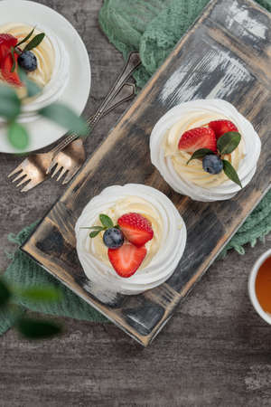 Mini Pavlova meringue with whipped cream and blueberries and strawberries, top view