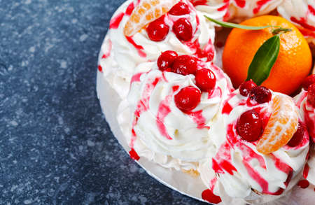 Meringue Dessert Pavlova Cake with Fresh Berries, Strawberries and Dried Orange Slice. Homemade Dessert.