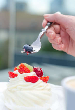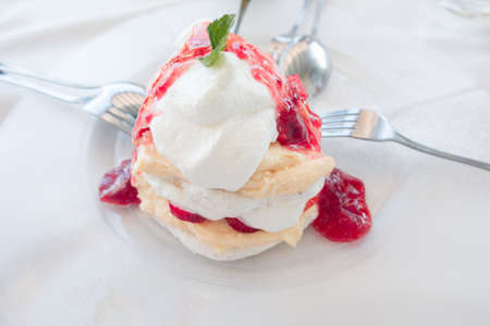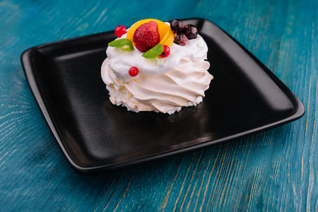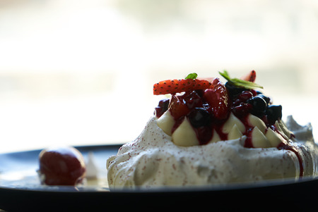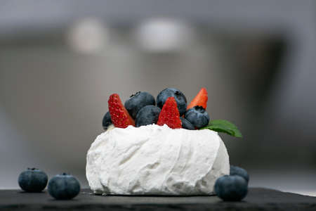 Pavlova is a meringue-based dessert with a crisp crust topped. Decorated strawberry, mint leaf, blueberry and whipped cream. Restaurant sweet food