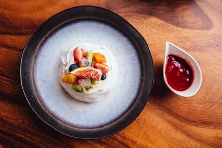 Meringue topping with fresh fruits including strawberry, mango, kiwi, blueberry and common fig served with sour fruit sauce.