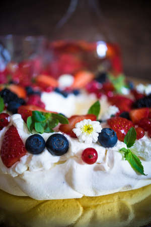 Sweet meringue dessert close-up decorated with strawberries, blackberries and red currants. birthday. holiday concept.