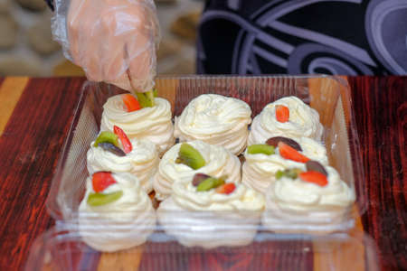 Pavlov cakes with fresh berries and cream. Lie in rows on a baking sheet in the confectionery shop.