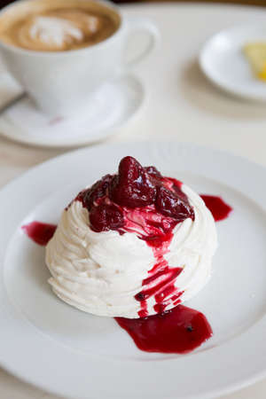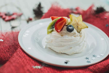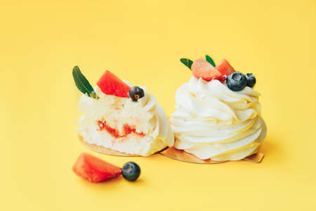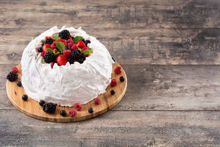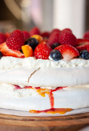 Summer fruit cake dessert Paclova. Served meringues pavlova cake with fresh berries and custard cream, close-up