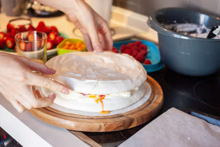 Pastries, preparation and sale of delicious cakes. Australian and New Zealand meringue dessert Pavlova with cream, meringue and fresh fruit. Delicious cake made from natural fresh products.