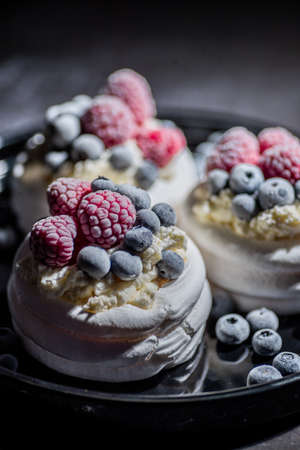 Delicious mini pavlova meringue desserts served with frozen frosty berries and mascarpone whipped cheese