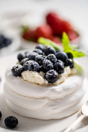 Delicious mini Pavlova meringue nest with blueberry and mint leaves