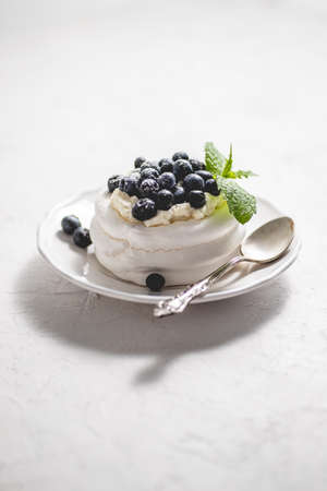 Close up of homemade individual meringue cakes Pavlova with whipped cream with mascarpone fresh blueberries and red currants in a white plate on a white stone background. Copy space.