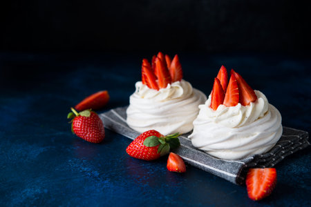 Anna Pavlova cake with cream and fresh strawberries on a dark background, copy space