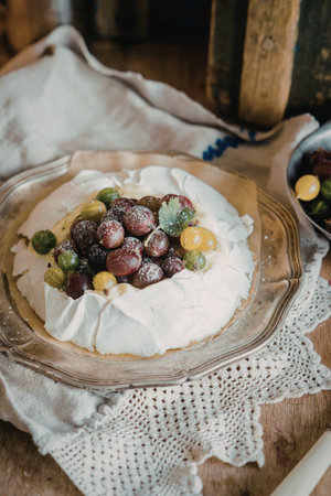 A beautifully presented pavlova dessert topped with fresh grapes, dusted with powdered sugar, and placed on a decorative plate. The setting includes a rustic wooden table with a lace doily and a bowl of additional grapes.