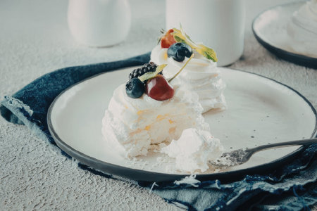 Mini Pavlova meringue cake with whipped cream and fresh berries on top on a plate on a gray concrete background. Summer dessert. Copy space