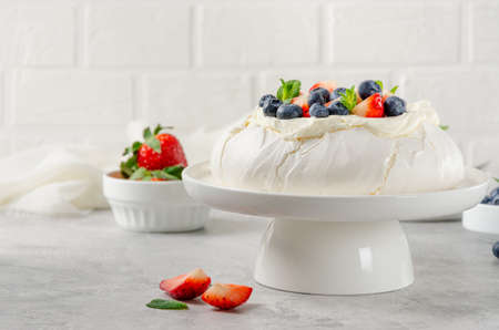 Meringue dessert Pavlova cake with fresh berries on a white plate.