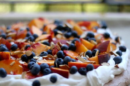 Chocolate Pavlova cake with whipped cream, peaches, blueberries and almonds. Selective focus.