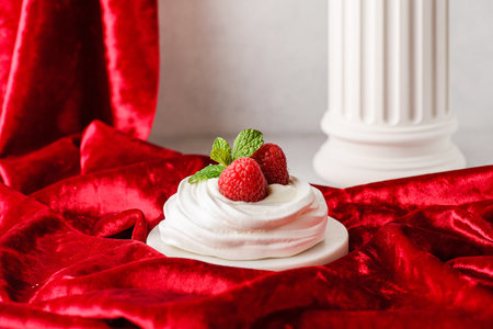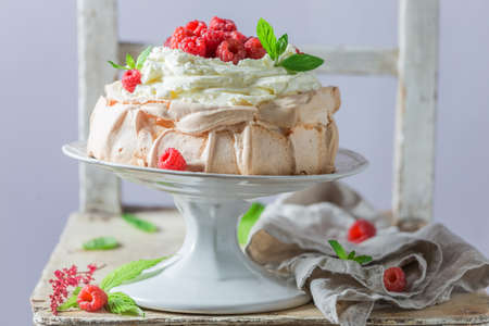 Pavlova meringue dessert with raspberries and cream. The dessert is made from egg whites and powdered sugar, as well as whipped cream and cottage cheese. Decorated raspberry and mint