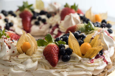 Delicious pavlova cake wreath of french meringue and whipped cream, decorated with strawberry, blueberries and physalis, cape gooseberry