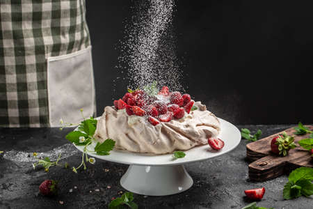 delicious homemade pavlova cake with fresh strawberries and whipped cream. chef hands with powder in a freeze motion of a cloud of powder midair. Culinary, cooking, bakery concept,