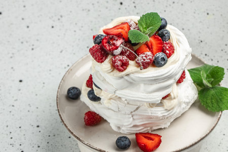 Food Dessert Background. Meringue dessert Pavlova cake with fresh berries on a plate. Stone background. Top view, copy space, flat lay