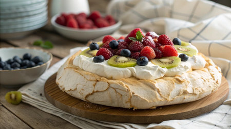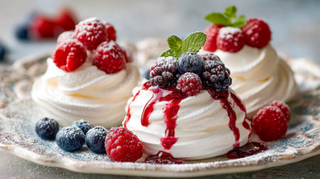 A delicate meringue base adorned with vibrant berries, fluffy whipped cream, and fresh mint leaves, creating an inviting and elegant treat perfect for special occasions.