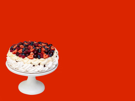 Meringue Pavlova cake with whipped cream and fresh berries isolated on red background. horizontal orientation