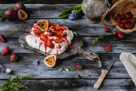 Anna Pavlova cake with cream and fresh strawberries on a dark background