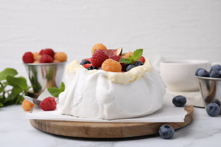 Pavlova cake (meringue dessert) with whipped cream, fresh berries and mint on white marble table, closeup