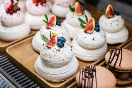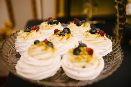Mini Pavlova dessert on a candy bar, wedding buffet table. cakes decorated berries and fruits