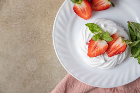 Mini Pavlova meringue cakes with strawberries and mint on a plate, concrete background. Top view. Selective focus.