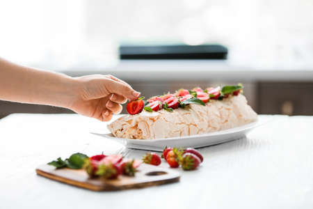 Woman decorating delicious meringue roll with strawberry on table in kitchen