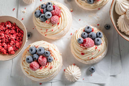 Creamy mini Pavlova cake made of frozen berries and mascarpone on white baking paper
