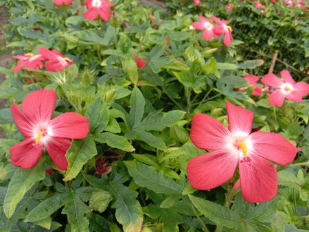 This image showcases a beautiful cluster of red flowers with white centers, surrounded by lush green leaves. The flowers are in full bloom, adding a vibrant splash of color to the garden. The plant appears healthy and well-cared for, with several blossoms visible, indicating a thriving environment. The background reveals more greenery, suggesting a serene and natural setting.