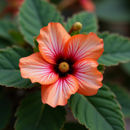 A stunning hibiscus flower unfolds its delicate petals in shades of orange and pink, surrounded by rich green leaves under soft daylight, embodying tropical charm and allure.