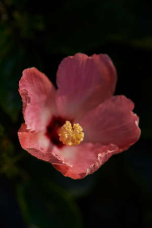 Beautiful pink hibiscus flower on nature on soft light - dark background, macro. Elegant amazing art image.