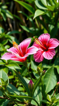 A wide shot of Hibiscus swaying gently in the wind, realistic photography style, bright and vivid colors, natural lighting.