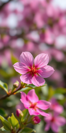Beautiful pink flowers in full bloom beside soft green foliage on a sunny day in spring