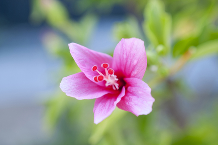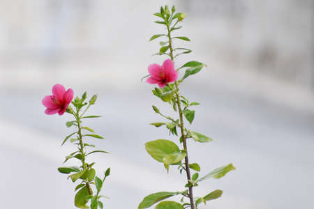 close-up of tiny pink hibiscus plant outdoor in sunny backyard shot at shallow depth of field