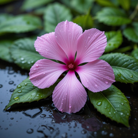 A striking pink flower stands out among deep green leaves showcasing its intricate petals. This natural beauty can be found in a serene garden bringing color and life to the surroundings.