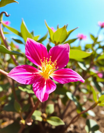 A striking red flower stands out against a bright blue background, capturing the essence of nature's artistry with its delicate petals and lush green leaves.