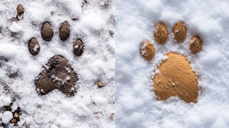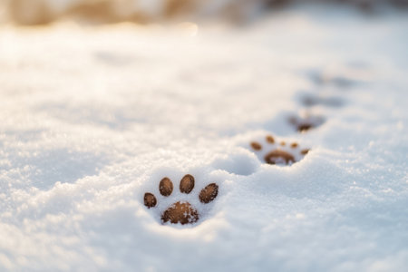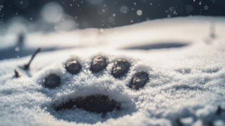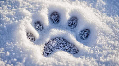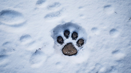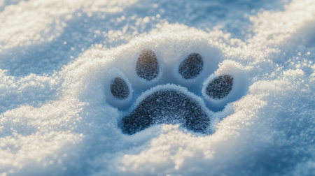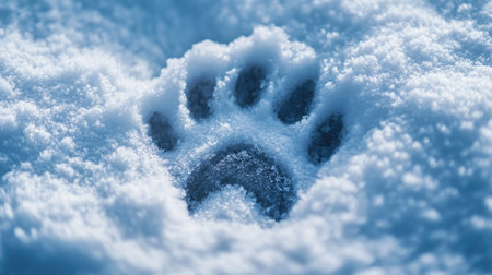 A detailed paw print in fresh snow, framed by soft shadows, evoking a peaceful and wintry ambiance.