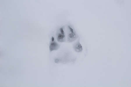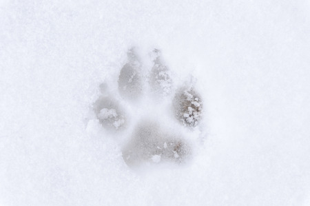 Paw footprint of an adult German Shepherd dog in fresh, white snow.