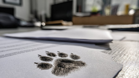 A cat paw print leaves a mark on paperwork while the desk remains tidy in the background, highlighting a playful visit during work hours.