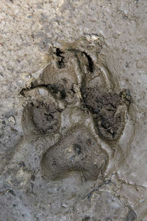 Wolf, canis lupus, paw footprints in brown mud. Tracks in dirt