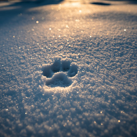 Delicate baby animal footprints are traced through soft snow, capturing the essence of a peaceful winter day illuminated by warm sunlight.
