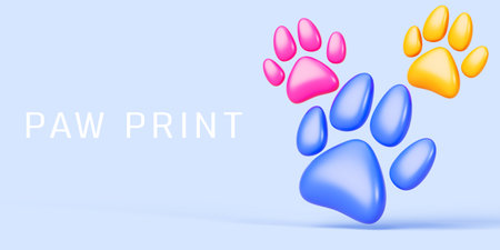 3d paw print cartoon banner. Cute color dog or cat footprints on blue background. Poster template for pet shop, grooming salon or veterinary clinic. Adoption homeless animals concept