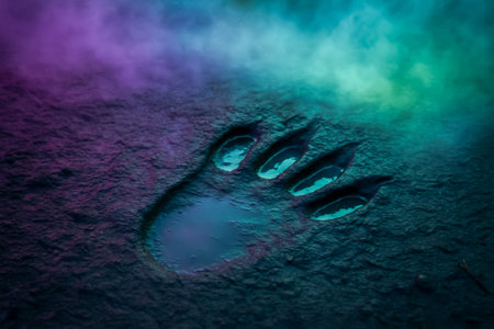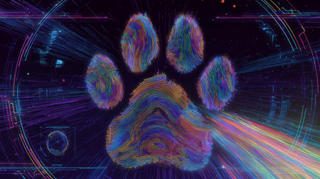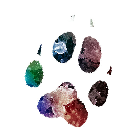 A close-up of a paw print surrounded by vibrant, colorful mist and textures