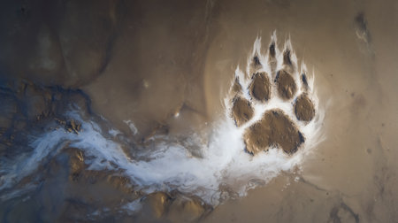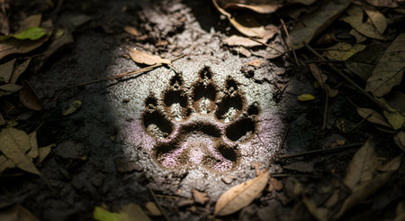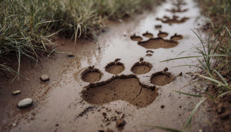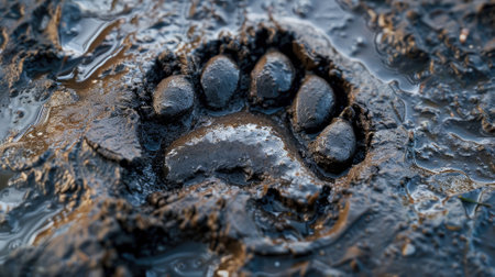 Fresh animal paw print embossed in wet mud, detailed texture visible