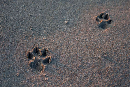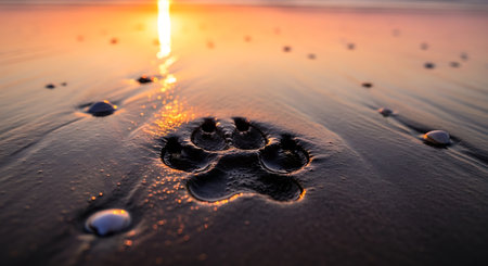 Dog paw print left in wet sand on a beach at sunset with reflection