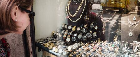 Barcelona, Spain - Jun 1, 2018: Curious elegant tourist woman looking at the front showcase window on central jewellery store in Spanish city choosing rings, earings, broches, pearls and diamonds