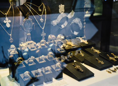 jewelry store window display with luxury jewellery and precious stones